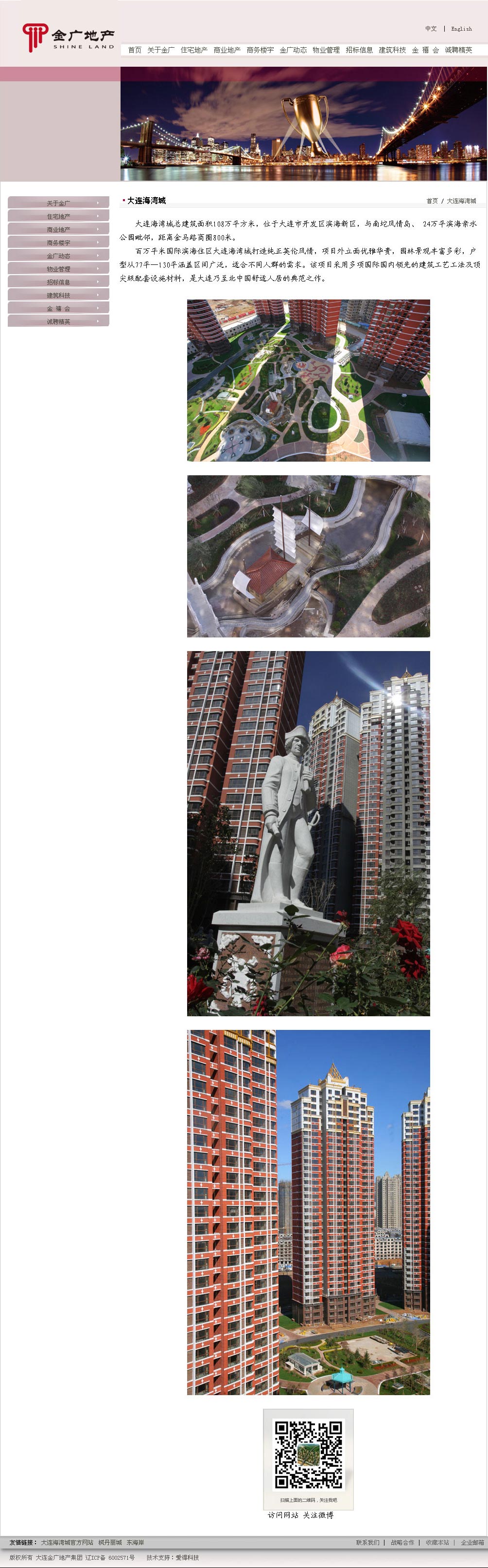 ? ? ? 大連金廣地產集團有限公司是大連知名品牌企業,是大連第一批進入房地產開發領域的企業之一,至今已有18年歷史。十多年的持續發展,成為大連房地產界最具綜合實力的支柱型企業之一,為社會的居住文化和人文環境奉獻了綿薄之力,為城市和歷史留下優秀的建筑作品。