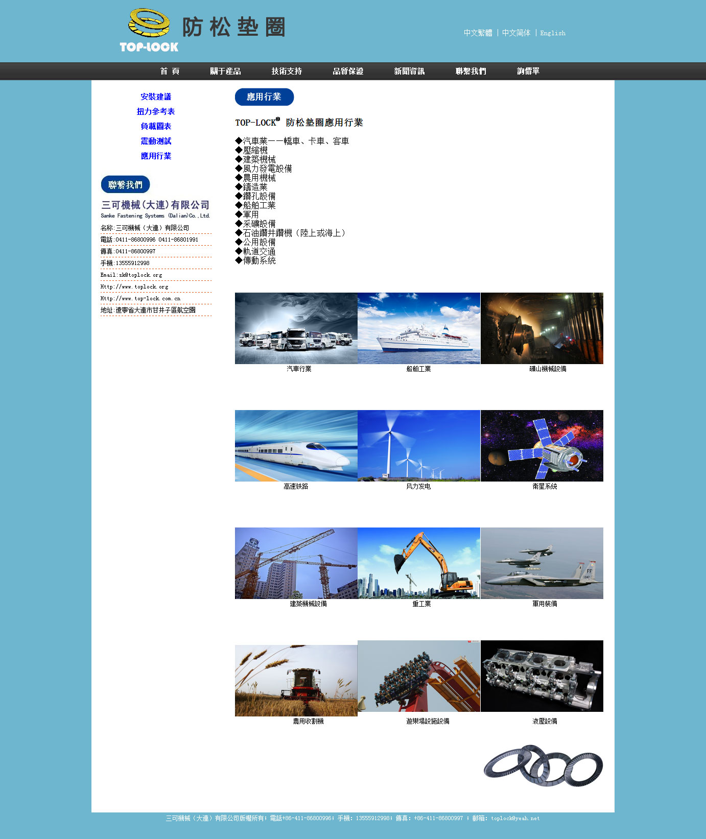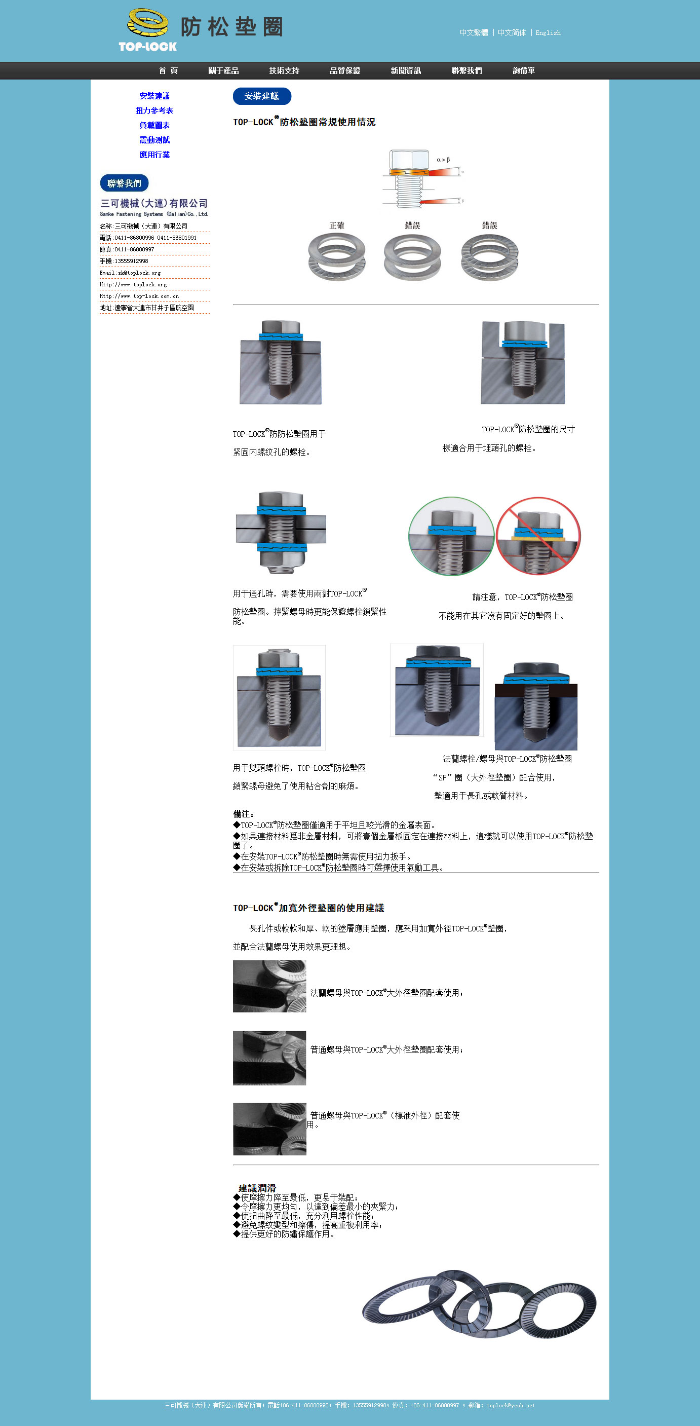 三可機(jī)械(大連)有限公司是集科研、生產(chǎn)、銷售一體化的大型企業(yè),主營(yíng)臺(tái)灣TOP-LOCK防松墊圈,配合螺栓螺母一同使用,具有防松緊固的作用,是高鐵指定品牌之一。